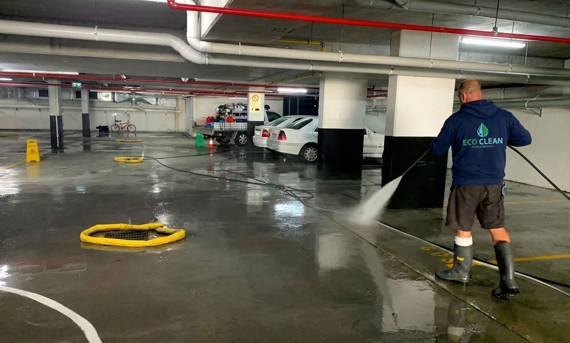 Large-scale pressure washing for expansive concrete areas, exterior walls, loading zones, and customer entrances.